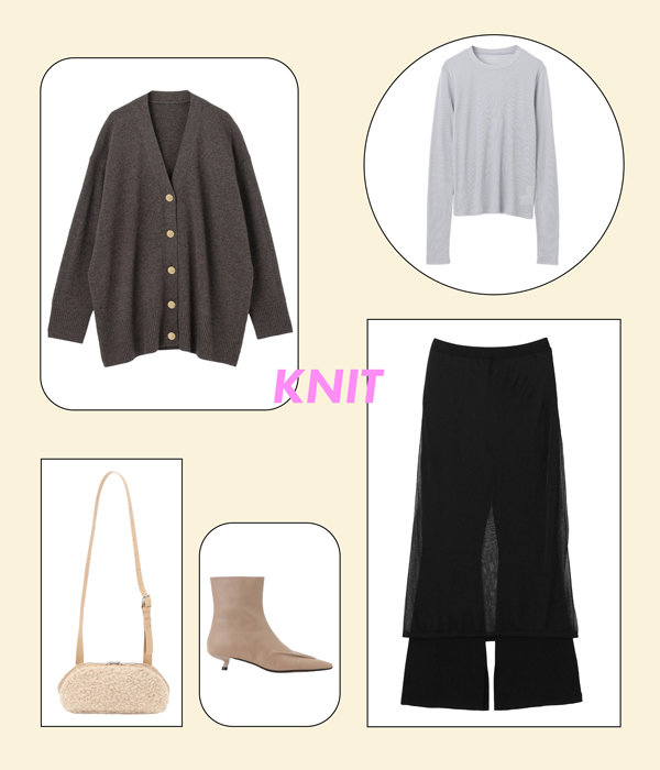 ✓同素材のカーディガンとマフラーのセット使いがポイントに