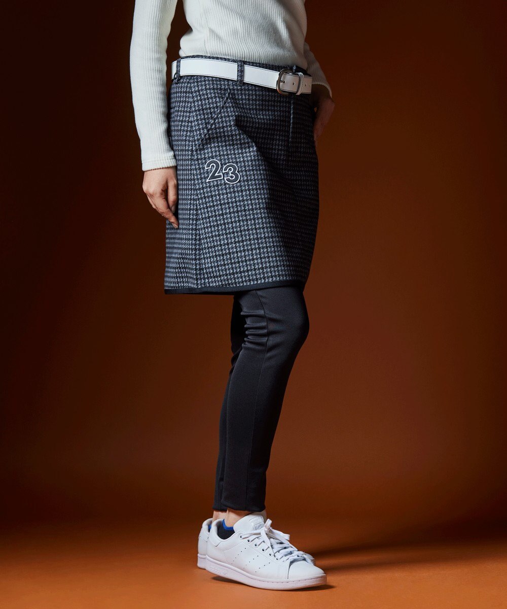 ガンクラブチェック柄がプリントされた、やわらかなジャージー素材のスカート。レギンスやタイツと合わせても、ハイソックスと合わせて膝出ししてもきれいに見える台形シルエットです。