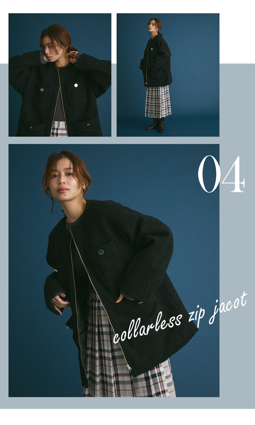 ノーカラーなので襟元に特徴のあるトップスと合わせてもきれいにまとまります。