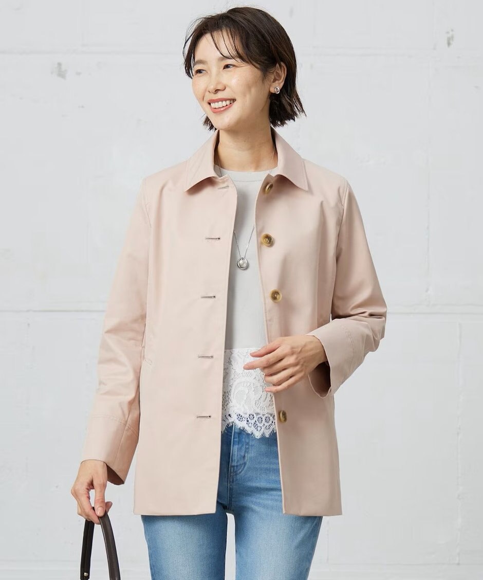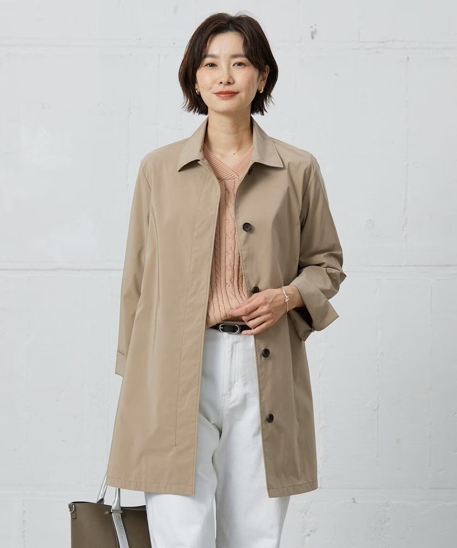 天候の変わりやすい端境期に重宝する!パウダリーなタッチの、すっきりとしたシングルトレンチコート。硬くなりがちなアイテムを、ポリエステルナイロンの軽く着やすいアイテムに仕上げました。オンオフ問わず幅広いスタイリングに活躍する1着です。