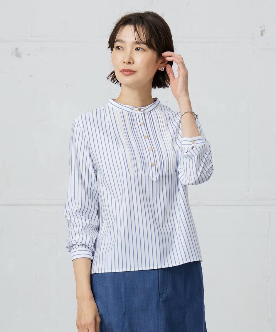 1枚でもインナーとしても活躍する!春らしい差し色の入ったストライプ柄の、着心地のいいピンタックカットソー。メタルボタンが華やかなアクセントの、ブラウス見えする1枚です。今年は春らしい差し色を入れてアップデートし、寒い時期のインナーとしても着映える柄にしました。