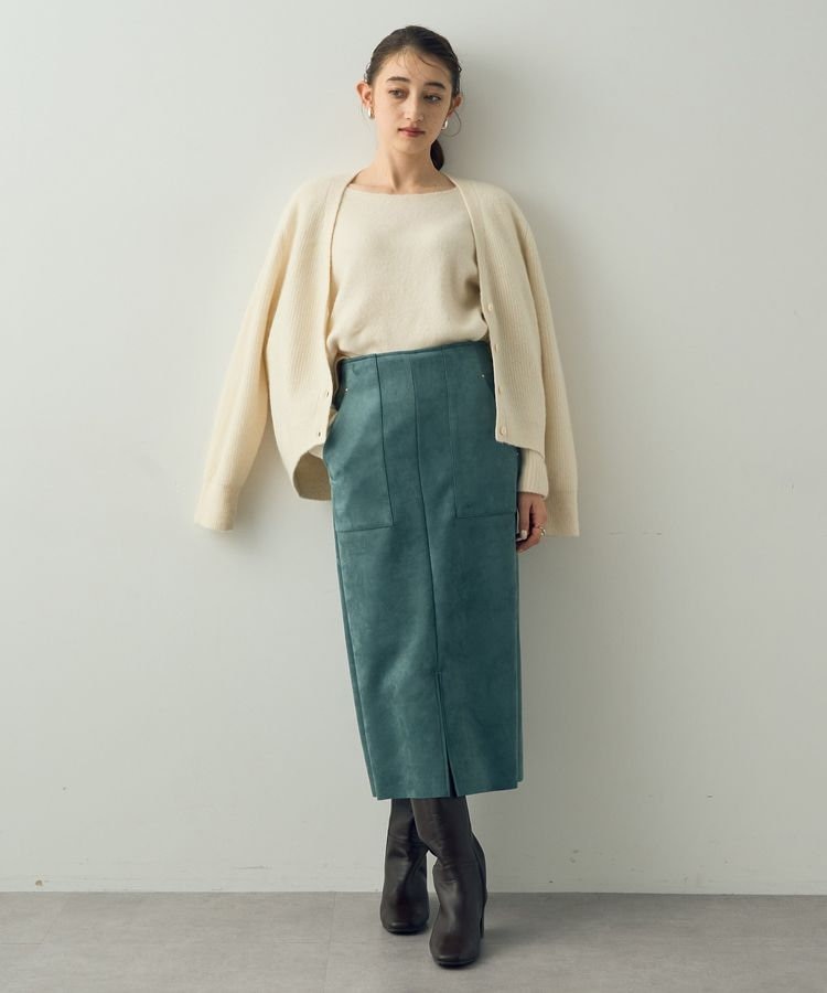 同素材のカーディガンを肩掛けすることで、こなれ感のあるスタイリングに。