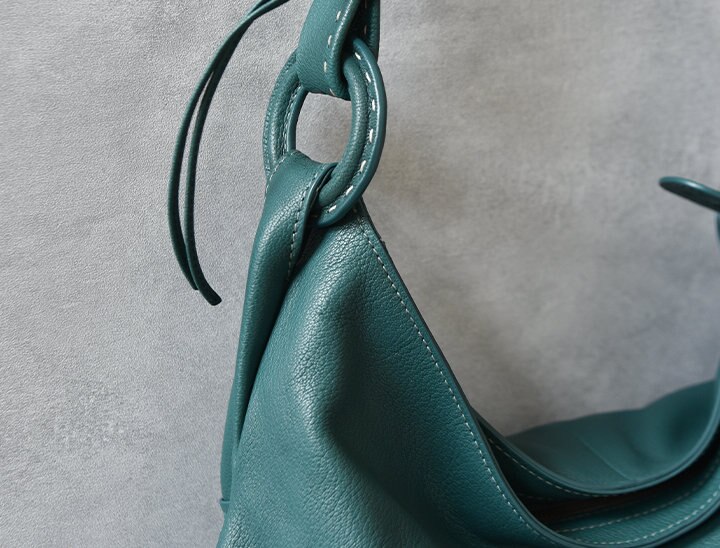 シンプルな装いながら、有機的なドレープやショルダー部分に施された繊細な手仕事が目を引くムース。美しいドレープを生み出しているのは、山羊革という素材とそれを最大限に活かした設計です。細かで均一なシボが特徴の山羊革を、鞣しによって柔らかな質感に仕上げたことで、バッグに品のある曲線が生まれます。