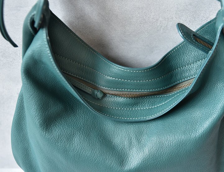 そこでムースでは、外側からは見えない少し下の位置にファスナーを設けることで、バッグの良さを損なわずに防犯性も高めました。ファスナーを取り付けたことで、ファスナーの重さがバッグ本体に伝わり、それが優美な曲線を生み出す要素にもなっています。