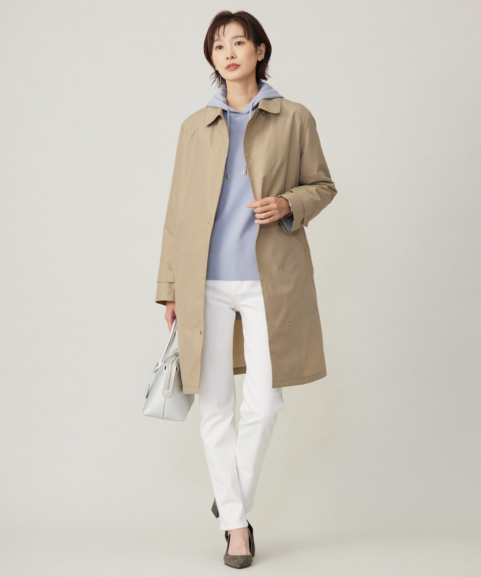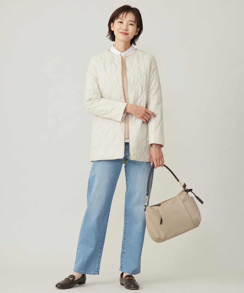 スッキリとしたシルエットの、ノーカラーのデニムジャケット。女性らしいシルエットが、優しい雰囲気の着こなしに見せてくれます。真冬はコートの下に、春には羽織るだけで大人のカジュアルスタイルが完成。同素材のスカートやパンツと合わせたスタイリングもおすすめです。