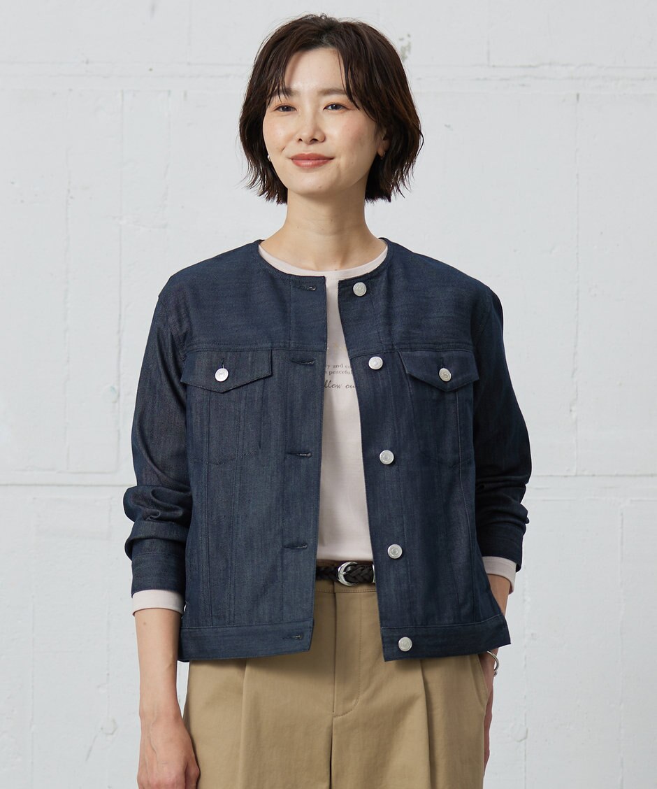 【洗える】セルロースシャンブレー ノーカラー デニム ジャケット