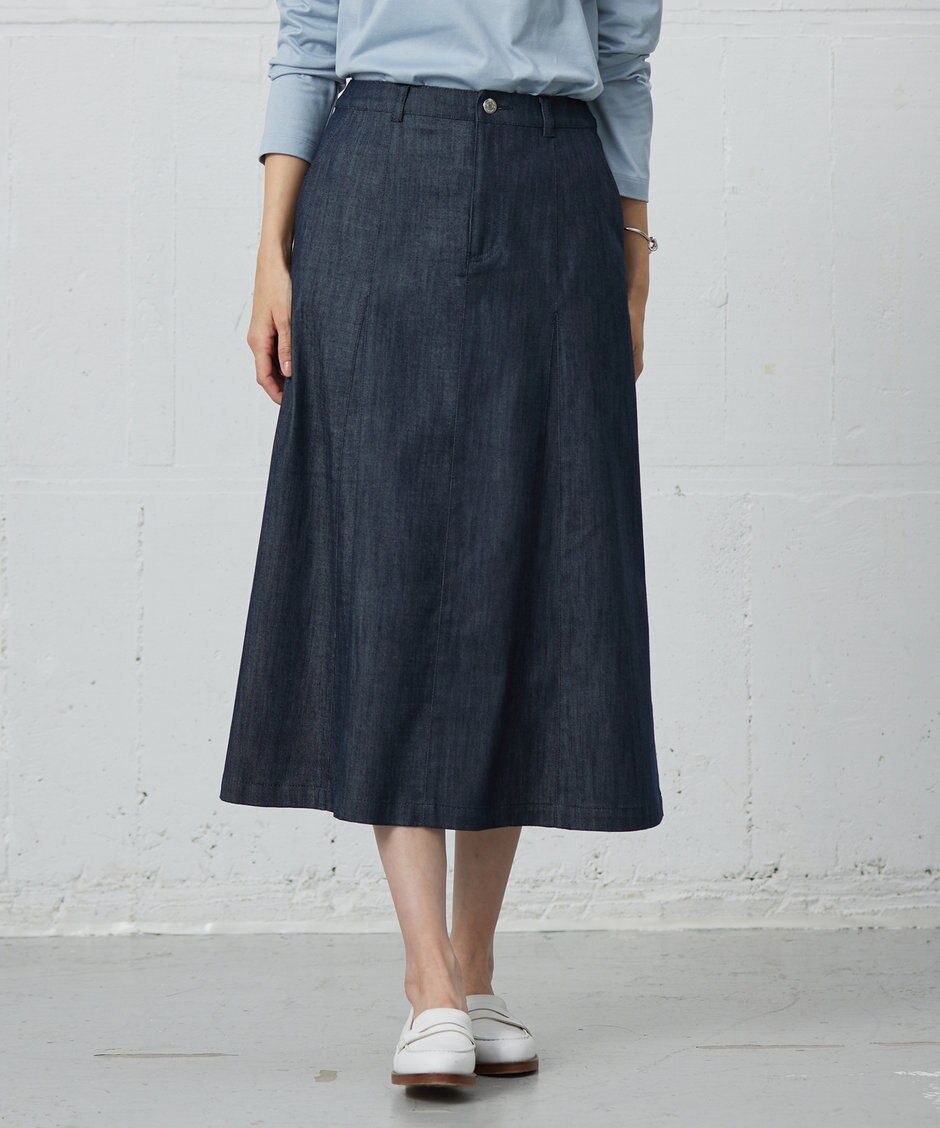フレアーシルエットのミディ丈スカート。カジュアルになりがちなデニム調のスカートを、女性らしく上品に見えるようにこだわりました。腰まわりはスッキリまとめた、美しいフレアシルエットが特徴です。コンパクトなトップスと合わせた、トレンド感のある着こなしがおすすめ。