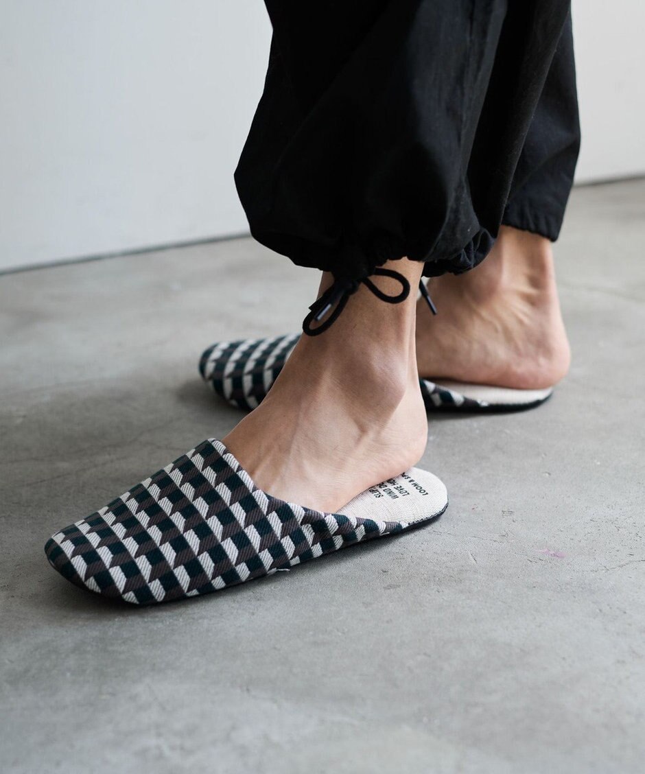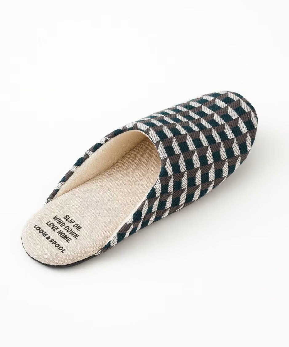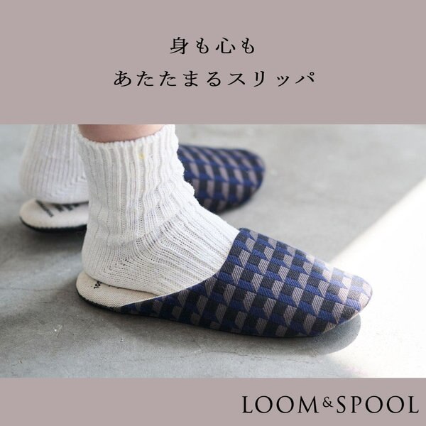 LOOM&SPOOLの「GeoVisソフトスリッパ」は西脇市の機織り工場に余っていた糸を集めてパズル感覚で作ったテキスタイルを使用したお部屋の中で足元を温めながら日常を彩ってくれる商品です。
