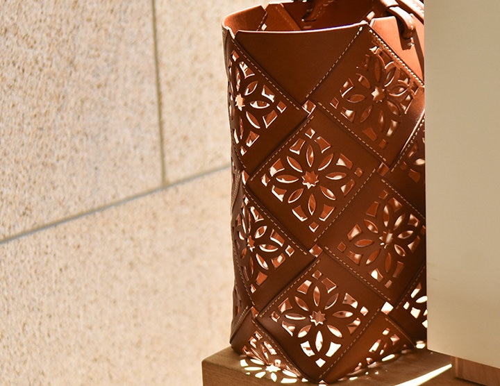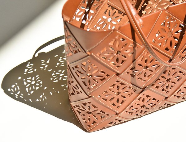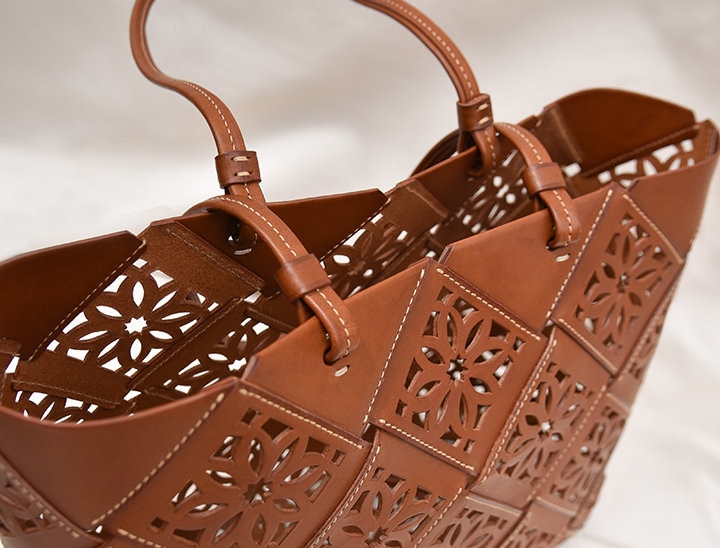 革を小さなパーツにカットして、一つひとつに模様の抜きを入れ、コバ(断面)を磨き、そして縫いはじめと縫いどめを繰り返すミシンワークで底面からの一体成型。技法を一つひとつ施す技によって、強度を保ちながら編み込んだバスケットのような仕上がりになります。