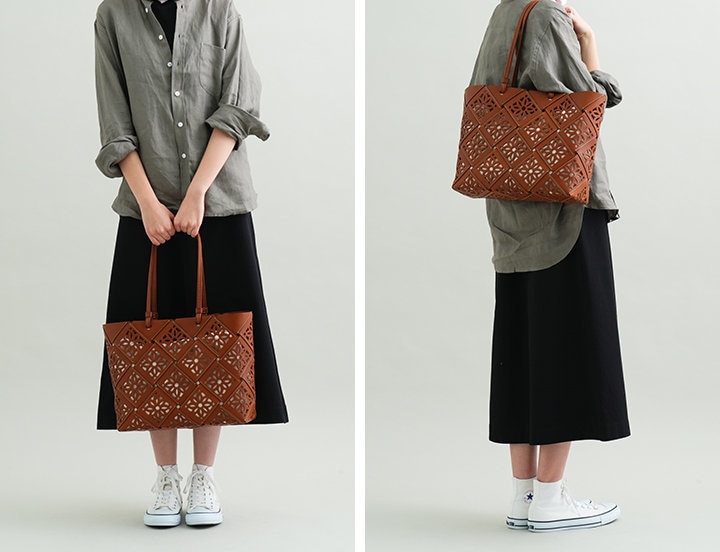 手提げバッグ〈大〉は、A4サイズもすっぽり入るゆとりのあるサイズ感。華奢で軽やかな持ち手は、肩掛けもできる長さにしました。収納力がありながらも軽量で、手にすると「あ、軽い」と驚かれることと思います。