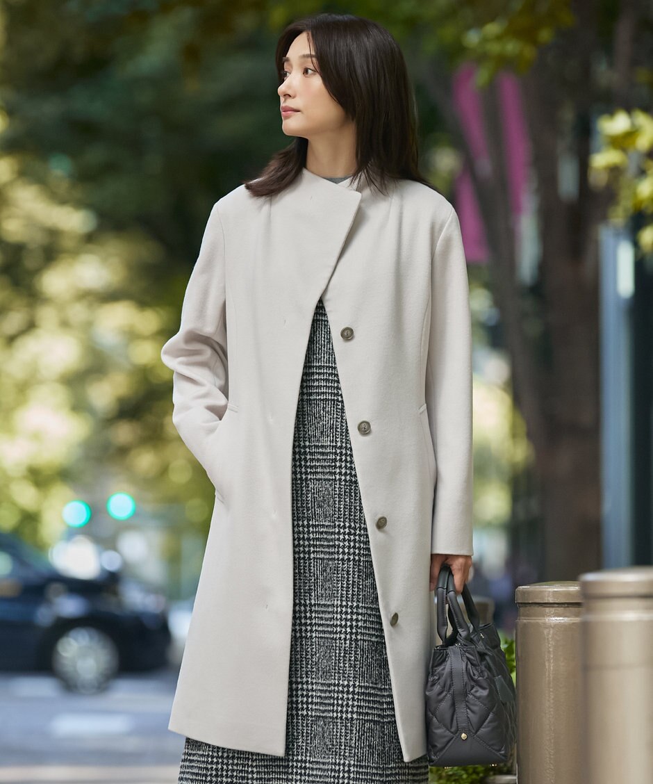 釦を開けて着用してもサマになり、閉じてもスタンドカラーのような見え方になる上品なコート。さらに共布リボン付きなので、お呼ばれシーンや食事会などでもきちんと感を与え、着た時のシルエットも美しく、大人な雰囲気で着用いただけます。