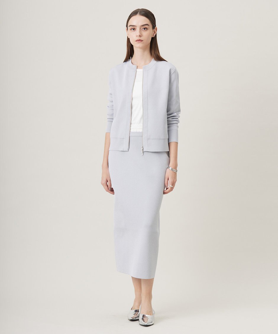 シルバーのニットブルゾンとスカートを合わせた、きれいめスポーティーなセットアップスタイル