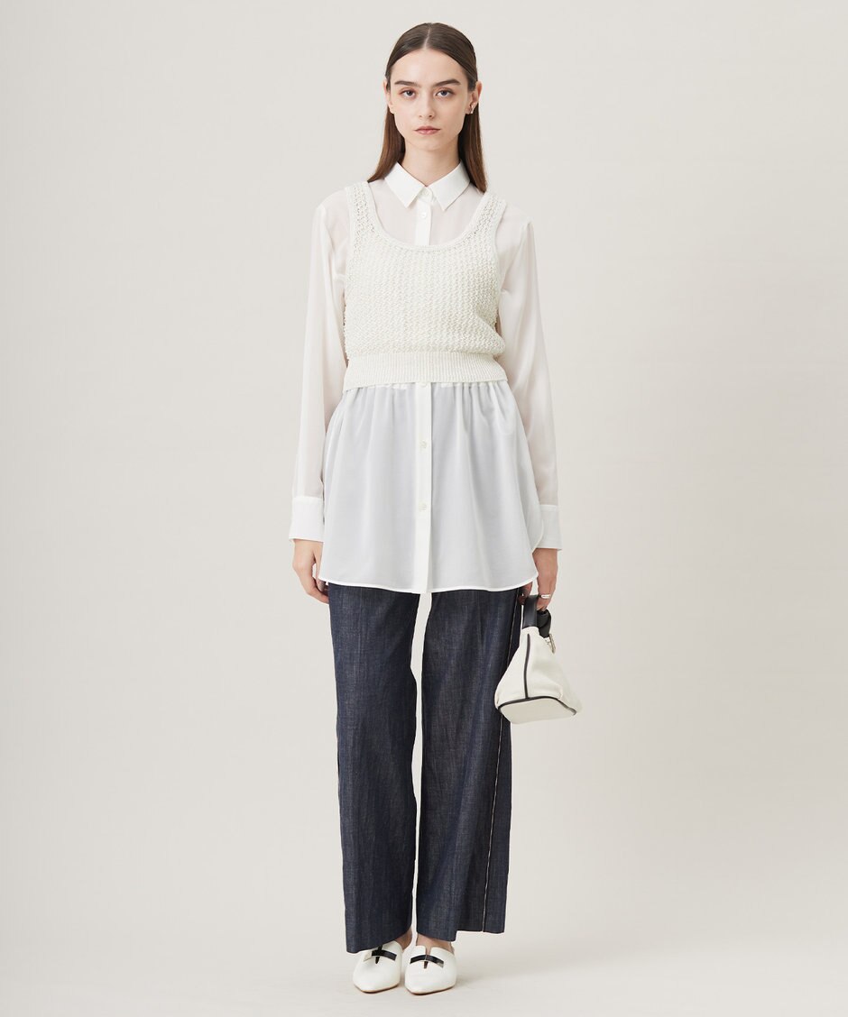 シアーシャツにクロップド丈のニットベストを重ねた、春を先取るレイヤードスタイリング