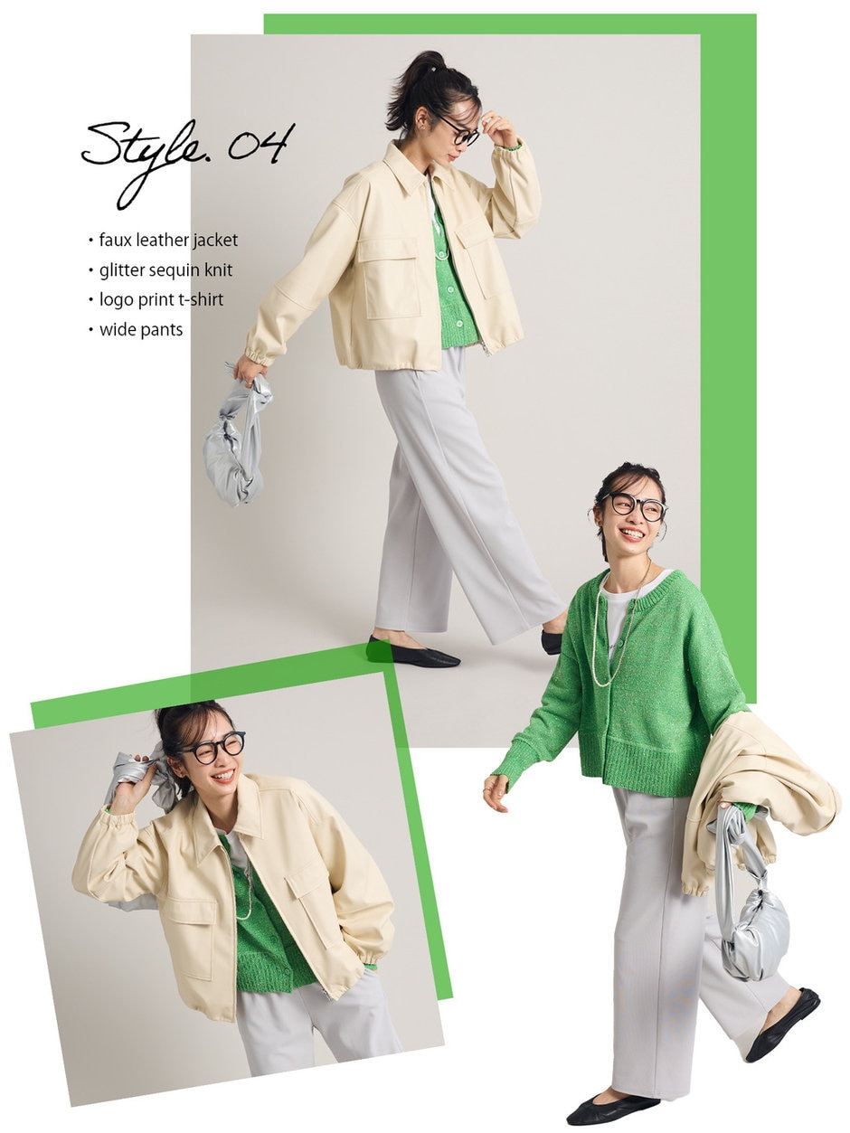 スパンコールニットは素材もカラーも華やかなアイテムで、取り入れるだけで春らしさのある明るい印象に。