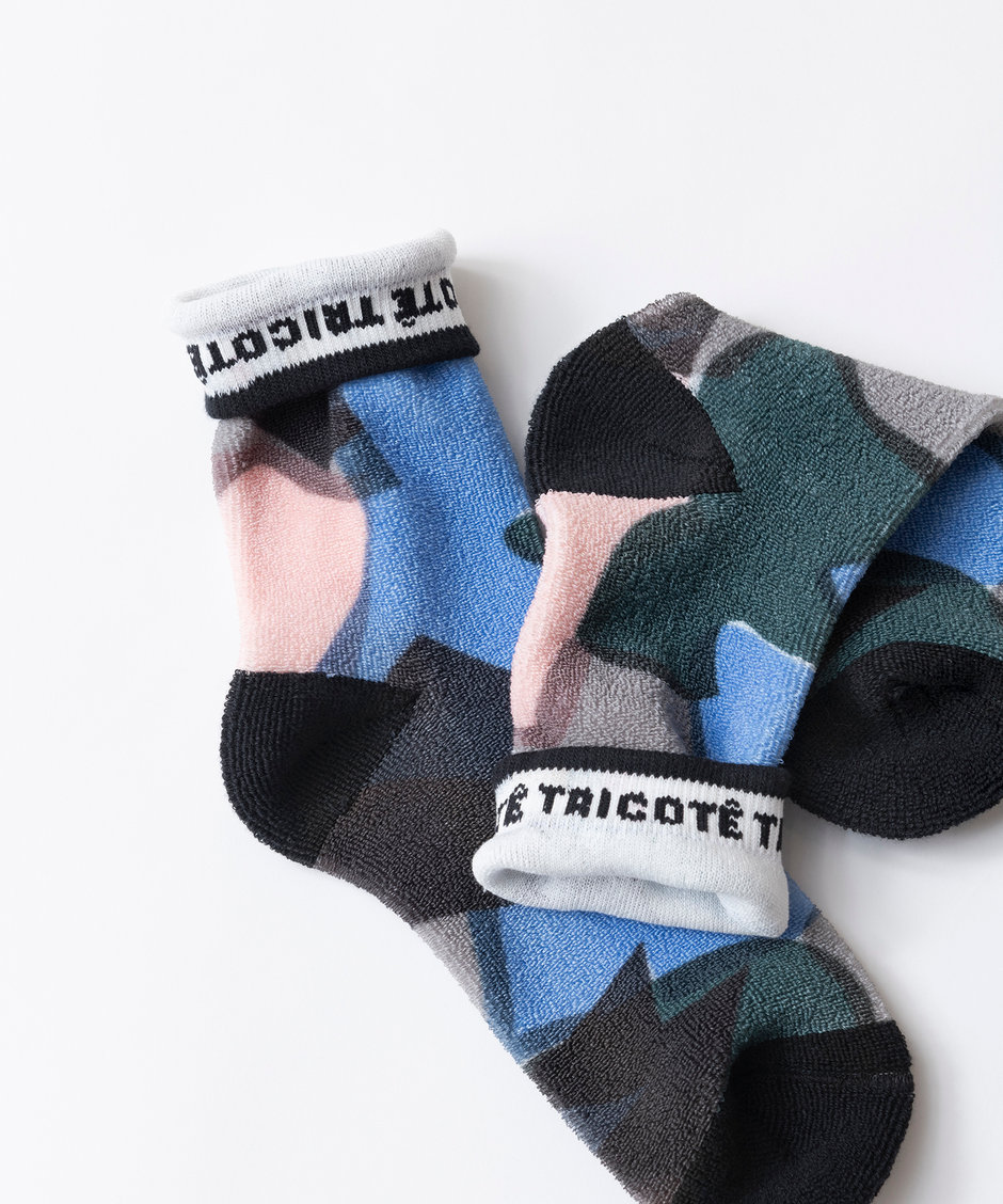 再生ポリエステルを使用したプリントパイルソックス。クッション性と保温性を兼ね備え、タオルに包まれたような履き心地が特徴です。