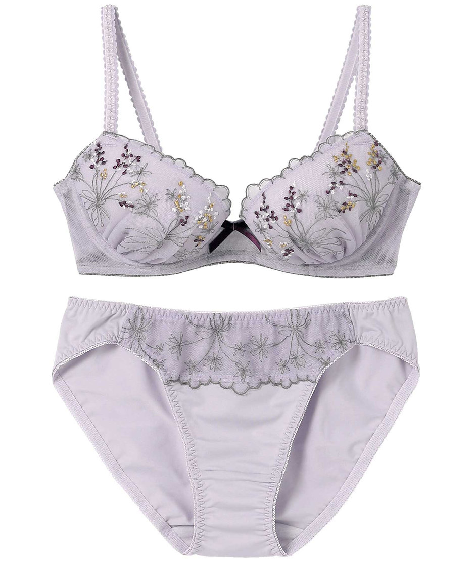 愛らしい小花ブーケをモチーフにしたエンブロイダリーレースが特徴的な、まる胸メイクのブラ&ショーツセット。