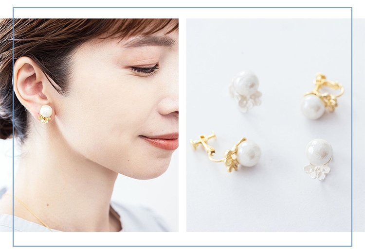小さなフラワーモチーフが連なる花座のフレームにΦ10㎜のコットンパールがセットされた、さりげなく華やかな印象のデザインイヤリング。一粒パールが目を惹く、普段着にも合わせやすいアイテムです。
