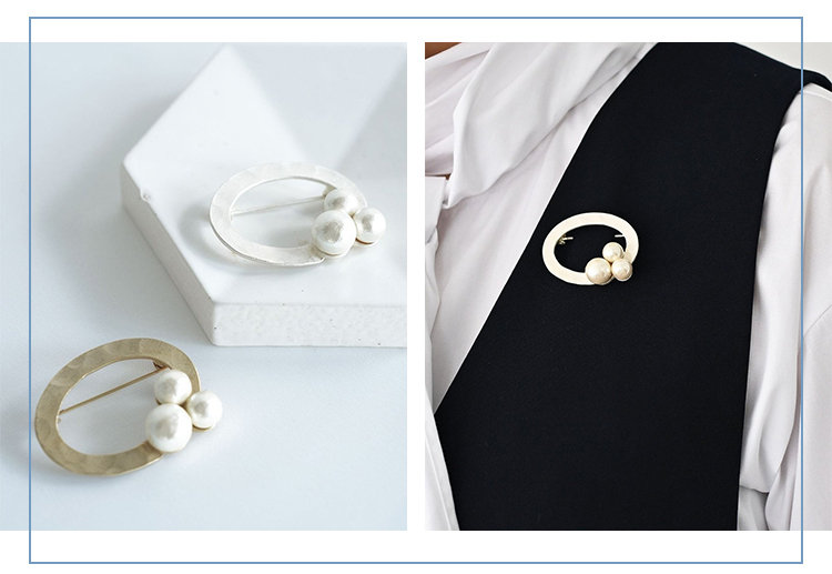 鎚目を施したオーバルリングのプレートに大小のコットンパールをワンポイントにデザインしたシンプルで華やかなブローチです。