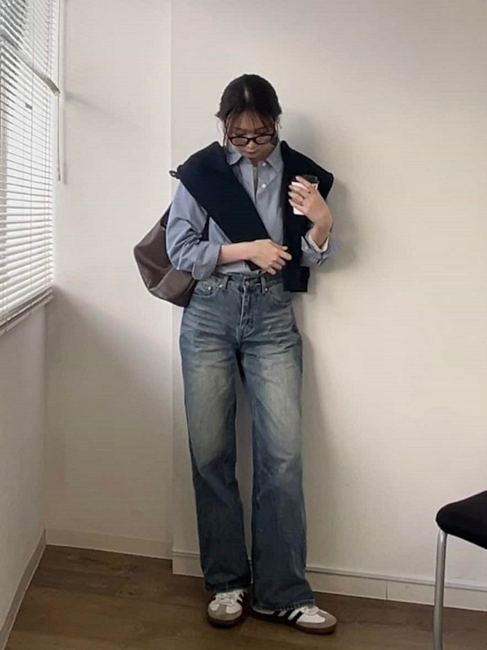 ブルーベースのコーディネートにブラウンを合わせて韓国っぽコーデに。