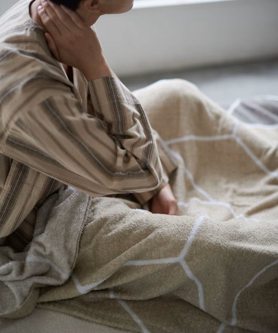 1年中使える肌にも優しい天然素材の"Flood of Light"コットンニューマイヤー毛布。目に優しいグラデーションのテキスタイルはインテリアと入眠のお手伝いをします