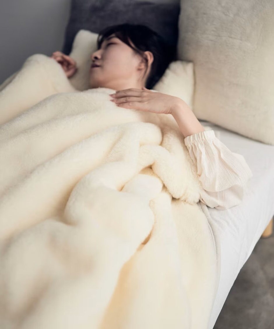 ウールの中でも特に風合いの良いメリノウールで、そして軽くてボリュームのあるニューマイヤーの技術で究極ともいえる毛布を作りました。