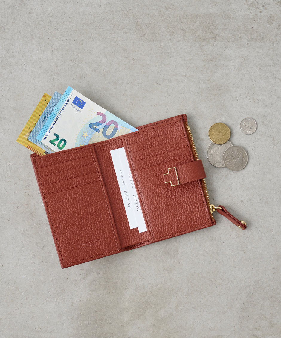 人気急上昇中の端正なスクエアシルエットの2つ折り財布。柔らかなシボレザーを使用していることで、最初から手馴染みがいいのも人気のポイント!