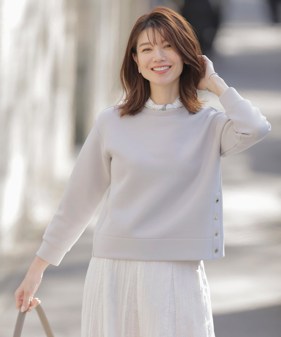 左脇の裾に、J.PRESSロゴ刻印の入ったオリジナルメタル釦を使用したカットソー。少し大き目のボタンと、ツルっとした表地でカジュアルに見えすぎないのがポイント。サイズ感も大きすぎない、コンパクトでシンプルなシルエットにしており、スウェットライクな形でもきれいめに見える1枚です。インナーにレングス長めのカットソーやシャツを合わせると、バランスもとりやすく、寒い時期から着用いただけます。