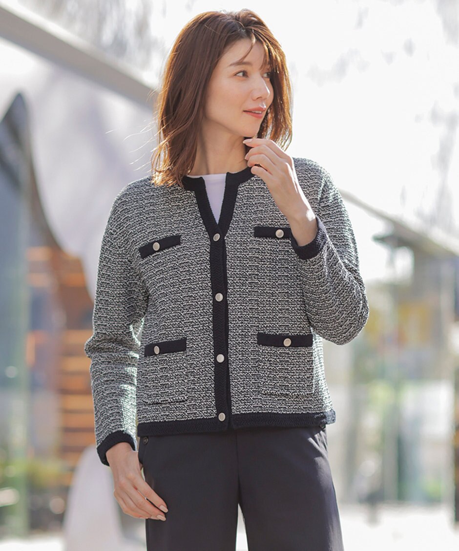 配色ラインがアクセントのカーディガンと5分袖のインナーがセットになったツインアイテム。J.PRESSオリジナルのメタル釦が上品に輝き、なめらかな手触りの春らしい素材が魅力です。配色ラインが、きちんと感とクラシカルなムードを演出します。ツインセットでもカーディガン、インナーそれぞれ単品でもコーディネートのアクセントになり、きれいめお出かけスタイルやオフィスシーンに活躍します。