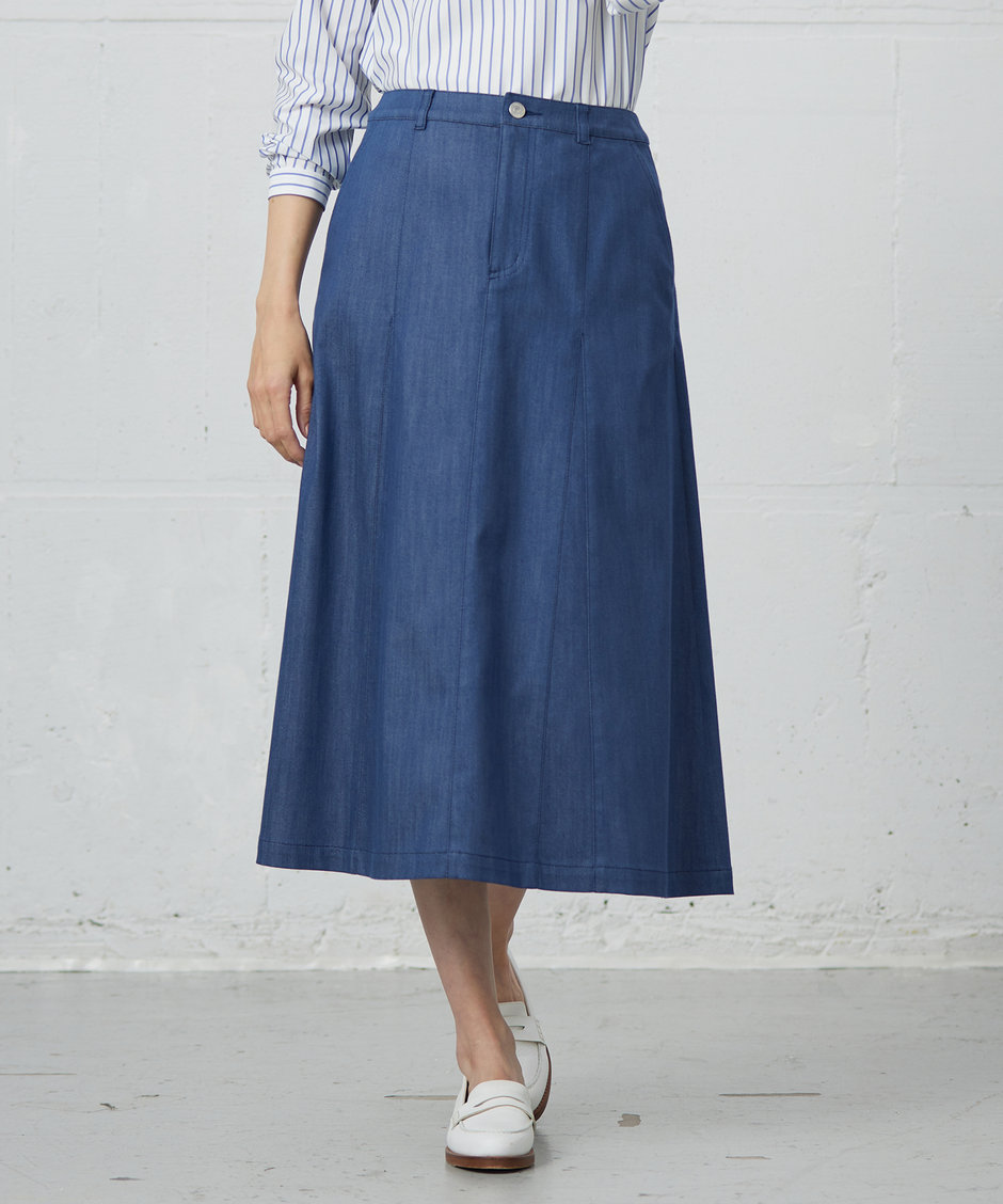 フレアーシルエットのミディ丈スカート。カジュアルになりがちなデニム調のスカートを、女性らしく上品に見えるようにこだわりました。コンパクトなトップスと合わせた、トレンド感のある着こなしがおすすめ。同素材のジャケットとの着合わせで、セットアップにも対応しています。