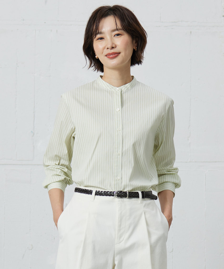 洒落感を演出する、クロップド丈のバンドカラーブラウス。ゆったりとした分量感で、リラックス感のある大人の雰囲気を演出します。袖は長袖で汎用性があり、長い期間着用できる優秀アイテムです。裾に前後差をつけているため、アウトにしてもバランスの良い着こなしに。カジュアルにもキレイ目にも着こなせるため、ワードローブに1枚あると重宝します。
