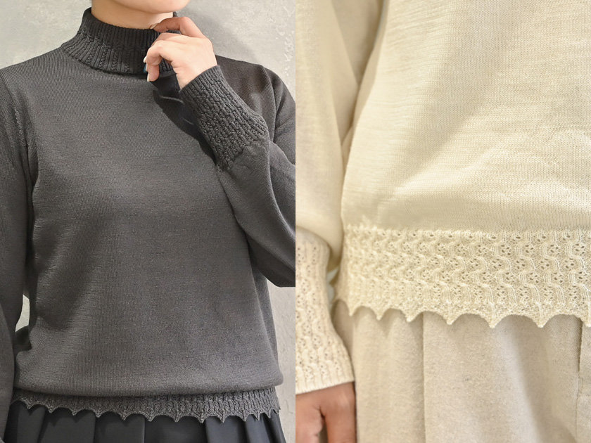衿・袖・裾をレース模様編みにしています。一枚でトップスとしてももちろん、ジャケットやワンピースのインナーにして衿や袖を少し見せるスタイリングもお勧めです。秋口から春先まで長く着ていただけて、オンオフ問わず様々なシーンで活躍するハイゲージニットです。
