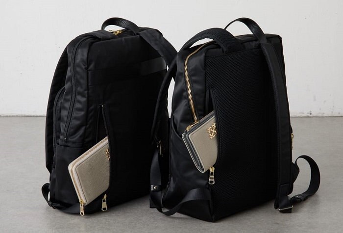 どちらにも背面ポケットがついていますが、スクエアリュックは長財布が入り、多機能リュックサックは折財布が入るほどのサイズで、ポケットのサイズが異なります。