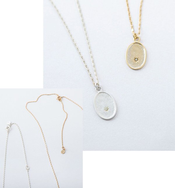 ビンテージ感のあるテクスチャーで仕上げたオーバルプレートに一粒の小さなクリスタルが輝くメダイユネックレス。