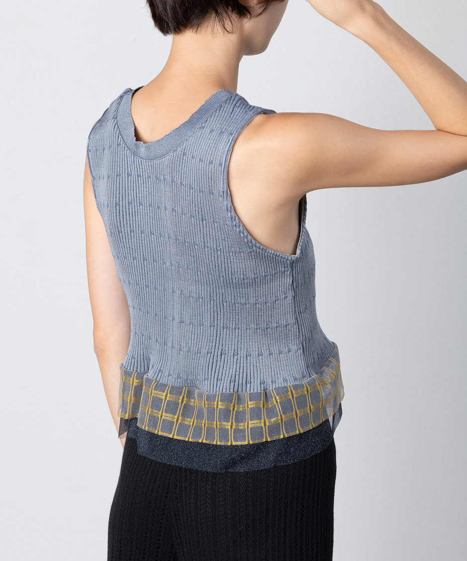 光沢のある糸で、身頃に雨の雫のようなアイレット組織を施した、ノースリーブニット。甘くなりすぎない上品な雰囲気で着て頂けます◎
