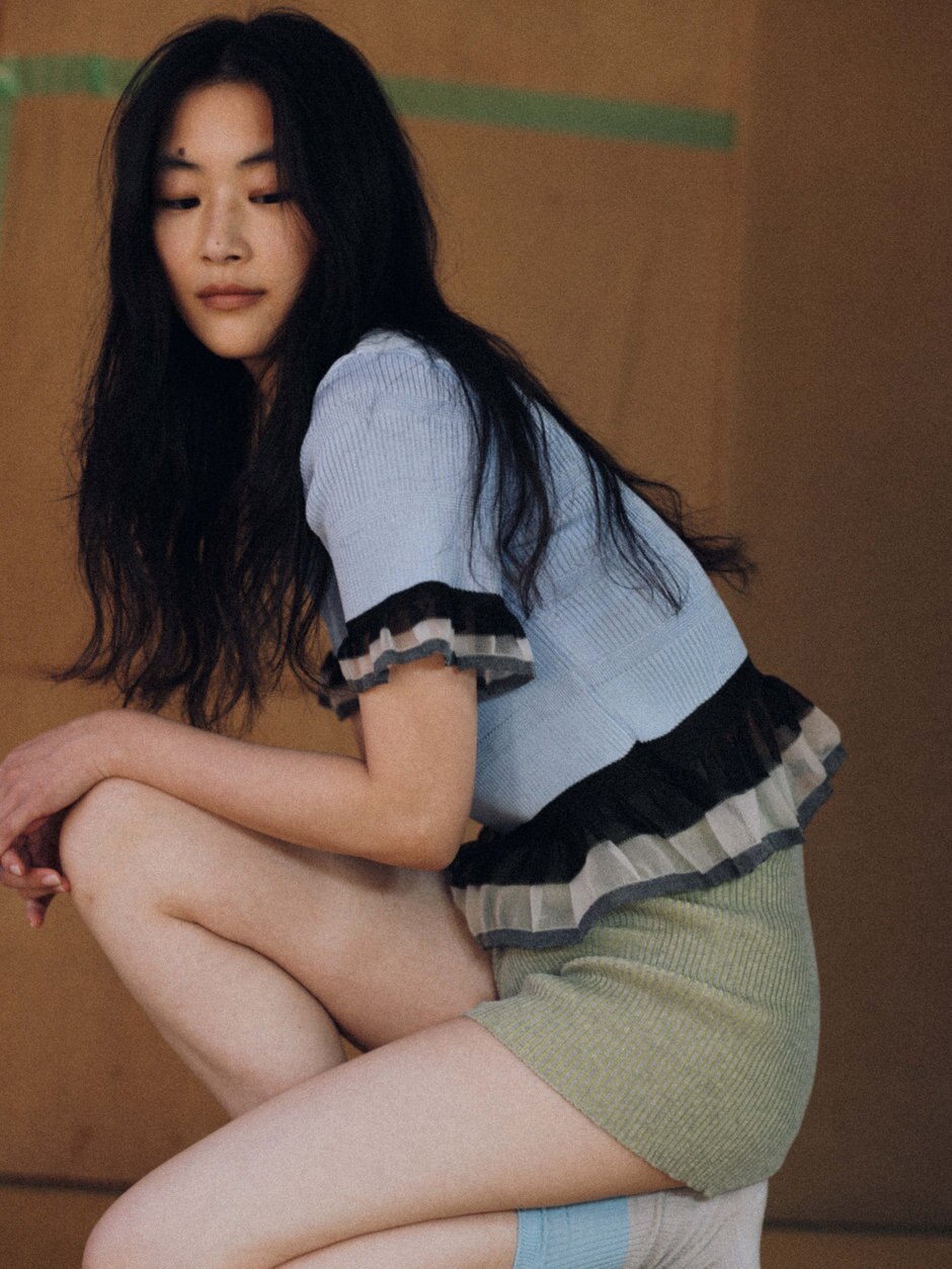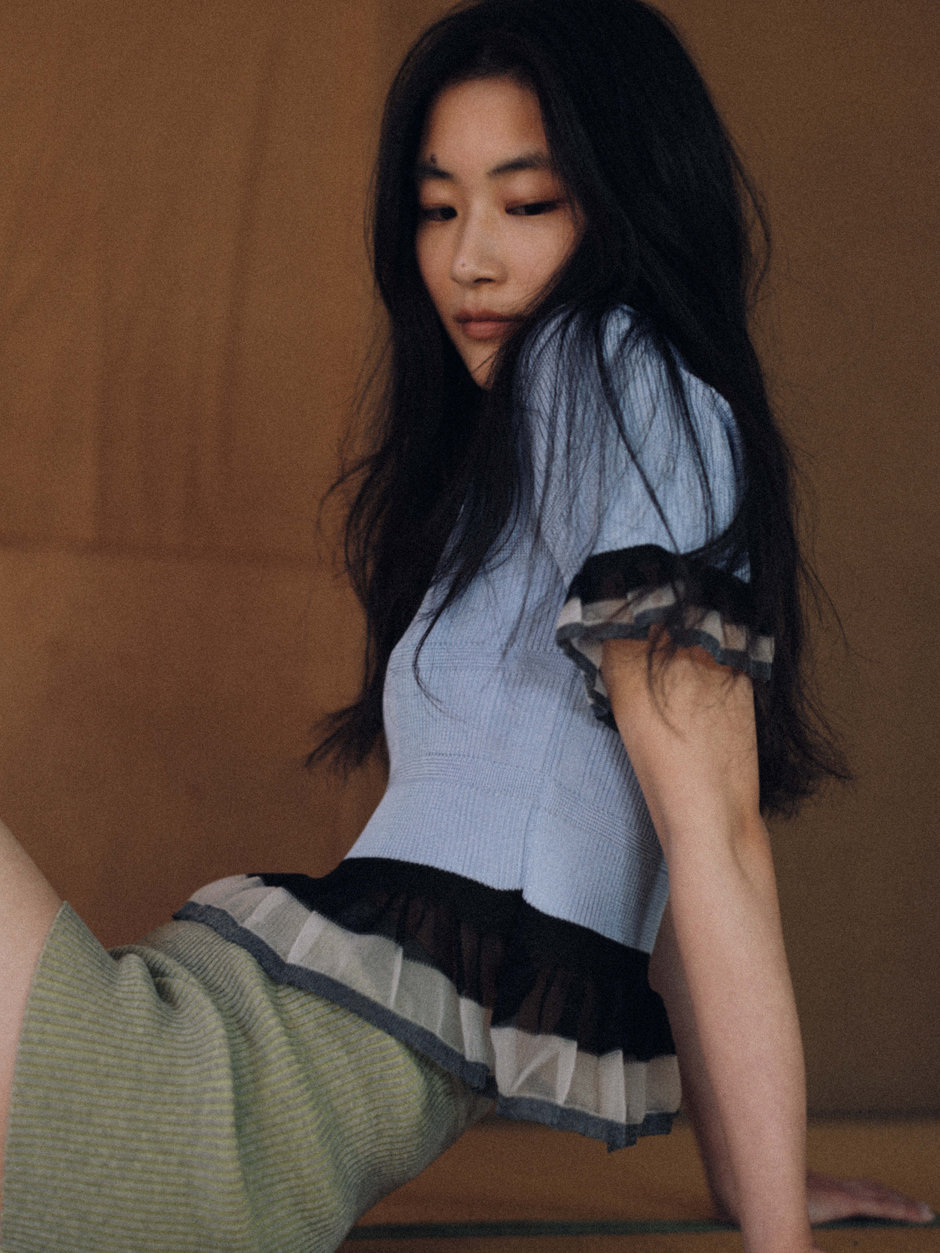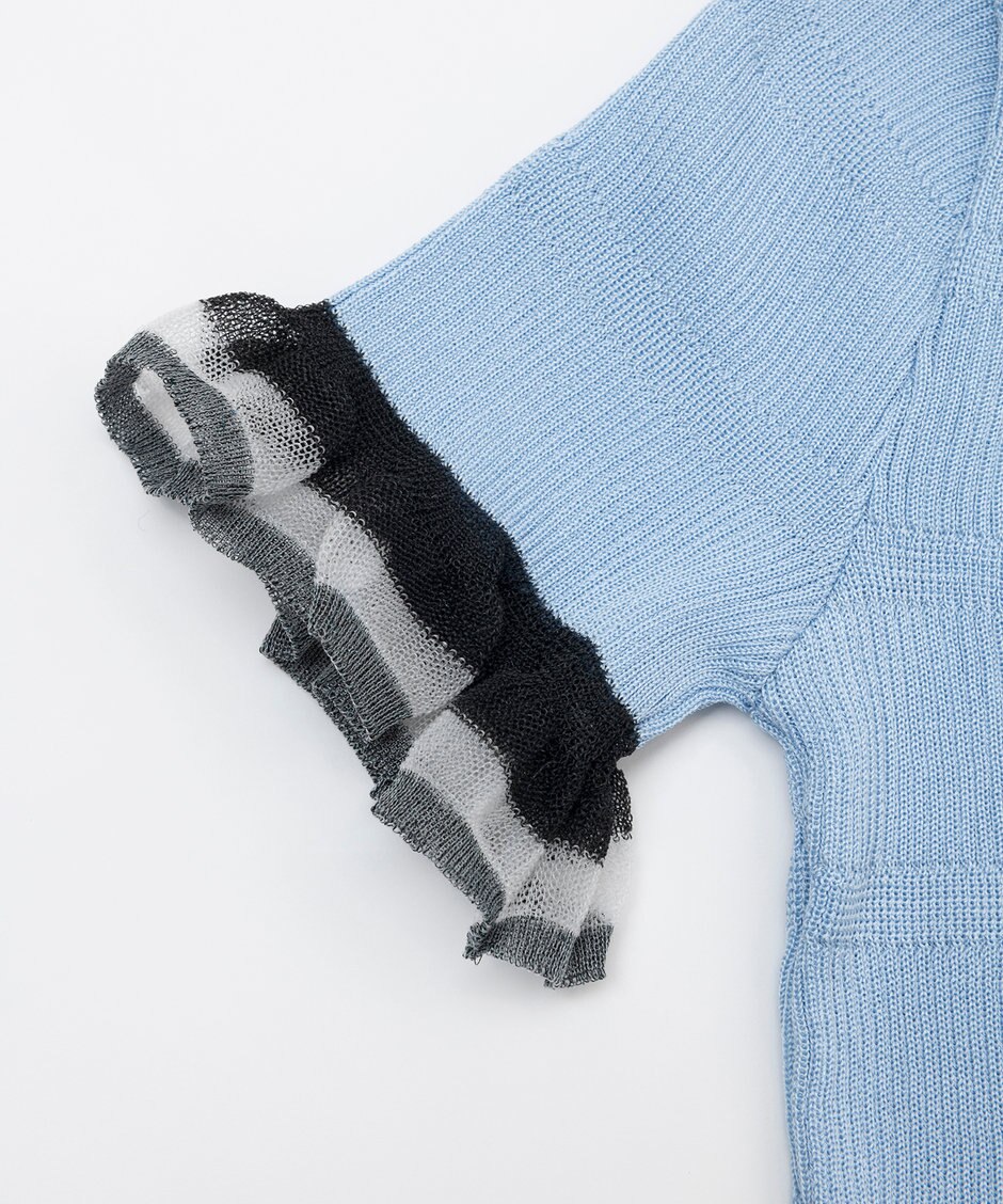 光沢のある素材をベースに、透け感のあるフリルをポイントであしらったニットトップス。柔らかな生地が体に自然にフィットします。