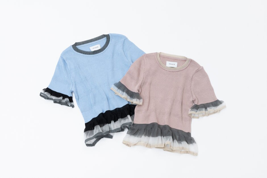 5カラー展開 BLOCK CHECK/RANDOM BLOCK/PAZZLE LINEの新柄+定番DOT/CHECK5.【シアーなフリルがポイント♪】リブTシャツ