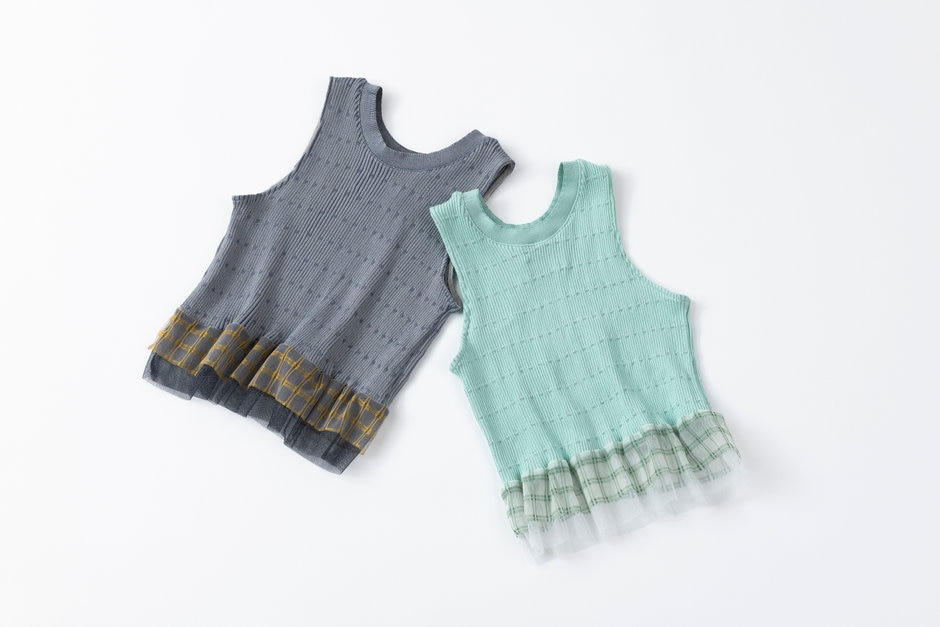 裾にはラメとチェックの2種類のチュール素材を重ね、繊細で柔らかい印象に仕上げました。夏らしい爽やかな配色もポイント♪