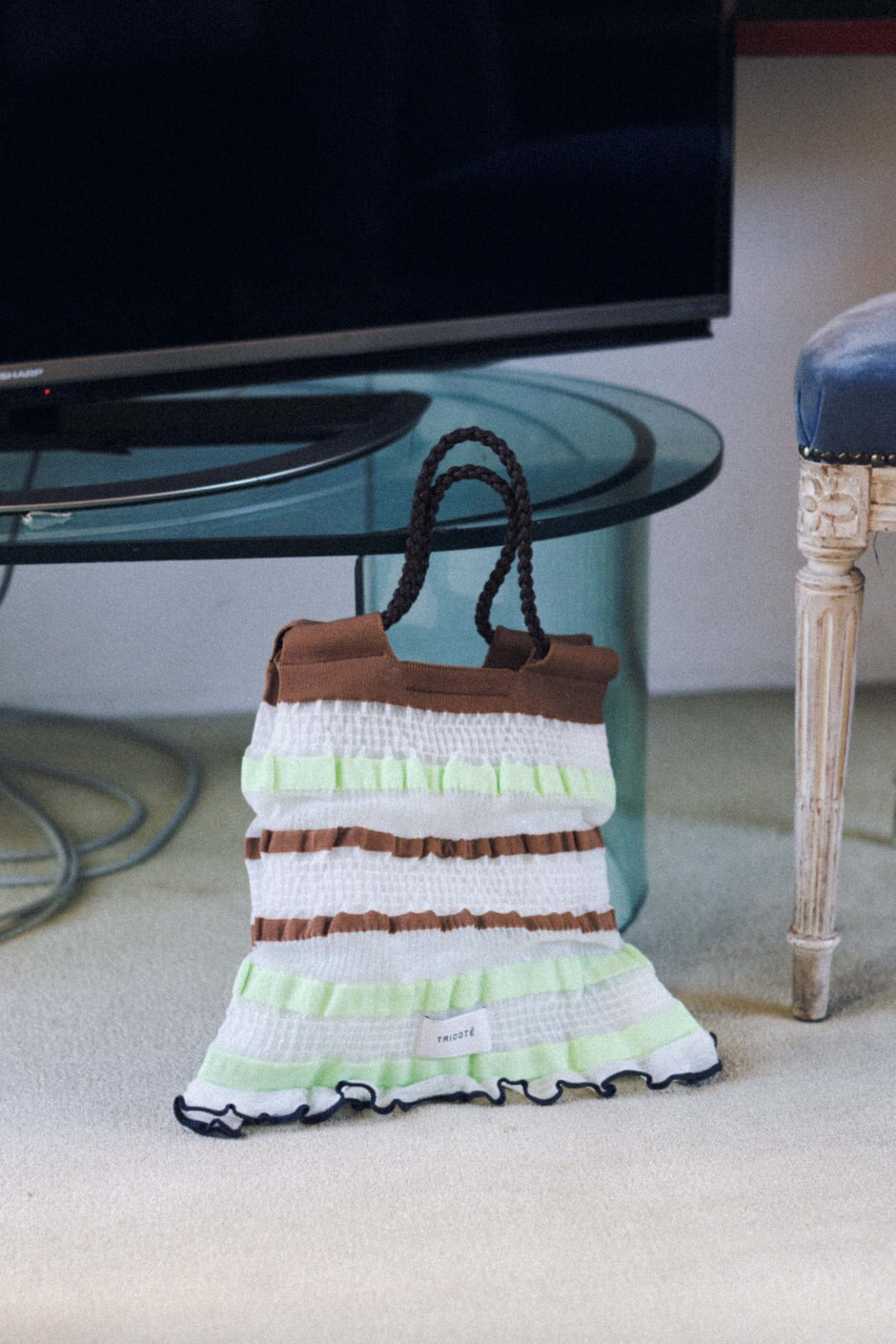 テグス素材を使った、ボーダー柄のニットバッグ。発色のきれいなテグスが涼しげな印象で、リブ組織と組み合わせた色の切り替えがポイントになっています。