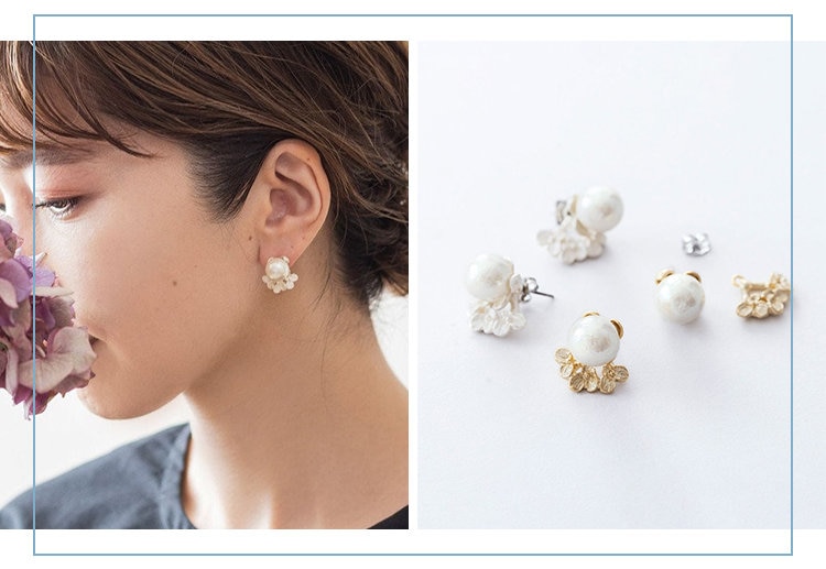 小さなフラワーモチーフが連なるジャケットプレートと10mmのコットンパールがセットされたピアスです。モチーフプレートは取り外し可能な2way仕様で花座のコットンパールピアスのみでも着用できます。