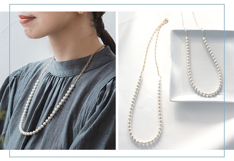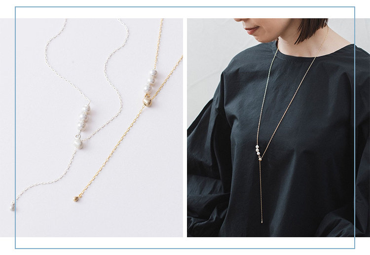 チェーンに通したメタルボールをスライドさせて好みの位置で長さとシルエットが楽しめるロングネックレス。ニュアンスのあるメタルボールのサイズに合わせた雫型のガラスバロックパールがアクセントになったデザインです。