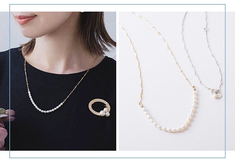 プレスしたスティックパーツを連ねたチェーンとライス型のパールを組み合わせたネックレス。淡水パールの柔和なニュアンスと小波チェーンのシャープな素材感をMIXしたシンプルモダンなデザインです。