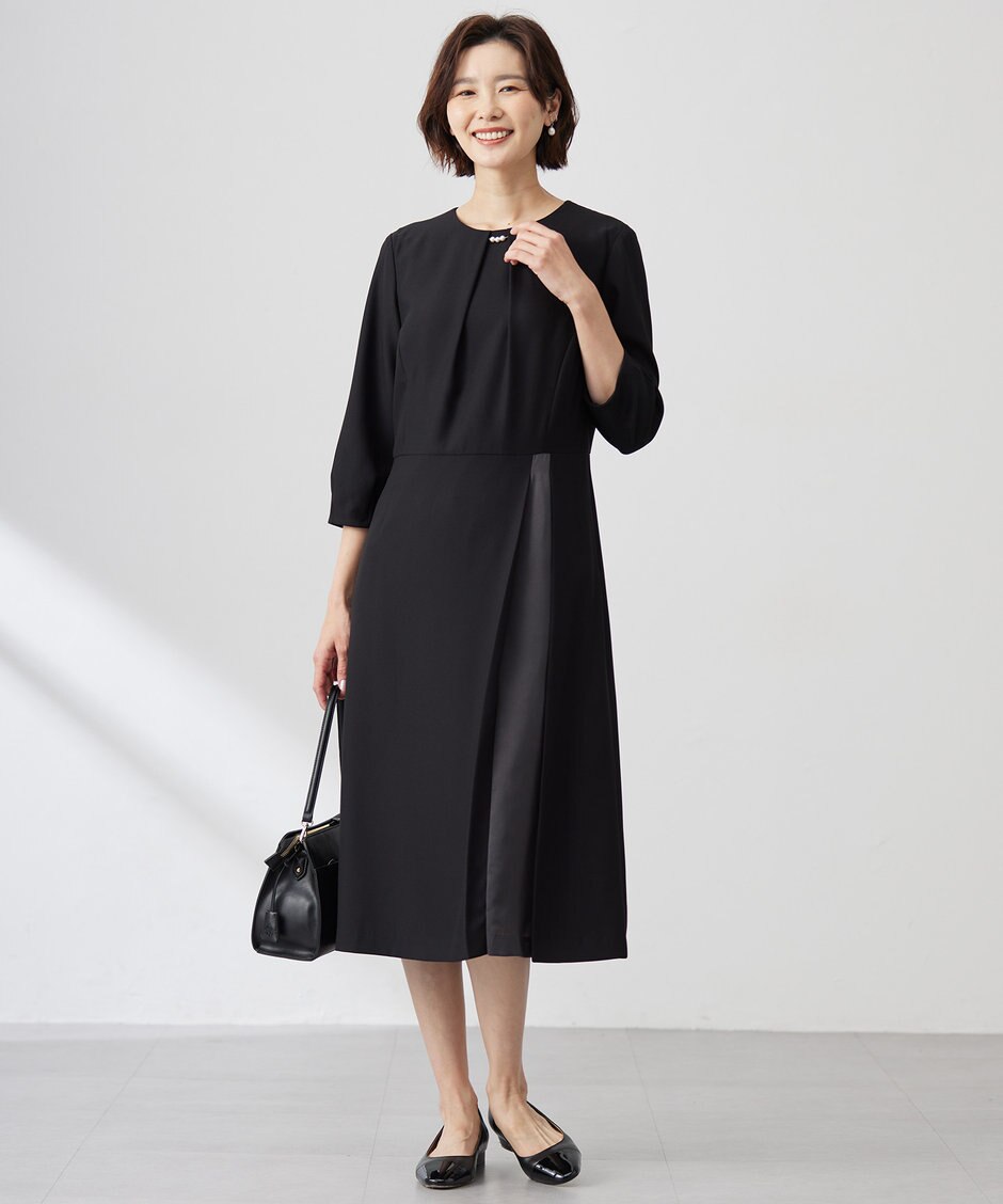 襟元のパールパーツは取り外し可能!上品なAラインシルエットのワンピース。スカートの左側部分にタックデザインと別布を使用して表情を出し、ポイントに。7分袖の袖口は外側にタックを入れ程よい膨らみ感のあるボリューム袖にして、女性らしい雰囲気に仕上げています。襟元のパールパーツは取り外し可能ですので、お呼ばれやオケージョンスタイルには装飾し、外して普段の通勤やオフィススタイルとしても着られる汎用性の高い1着です。