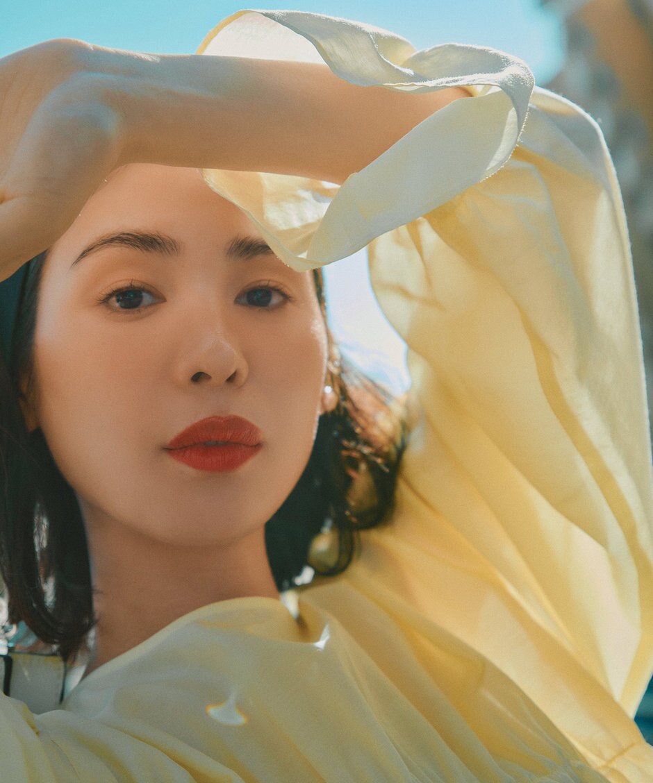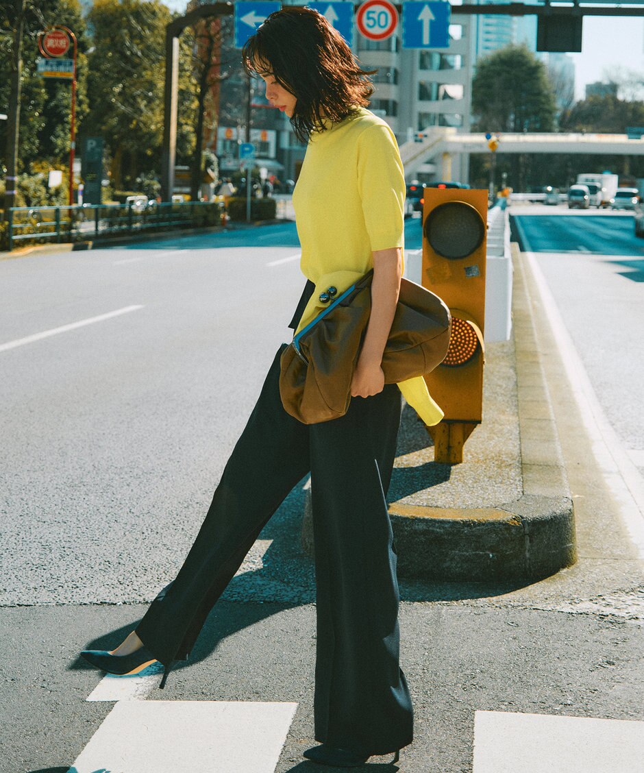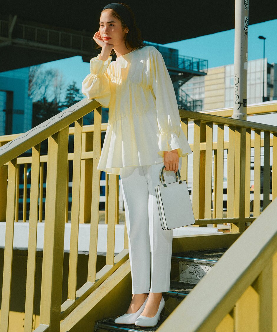 透過性を感じるライトイエロー。デザインブラウスに大人の抜け感をプラスする。