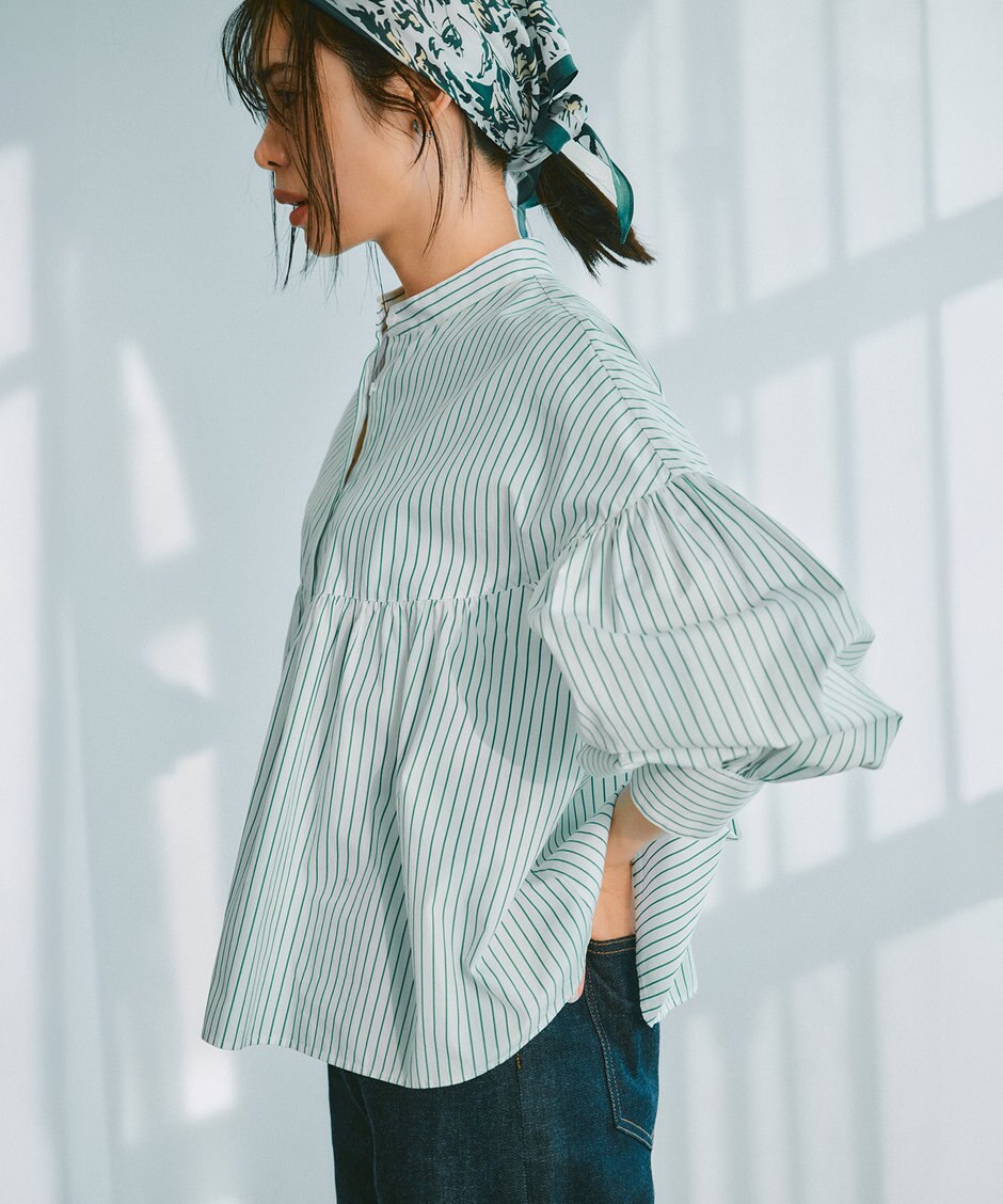 正統派インディゴデニムとストライプ。相反するボリューム袖の絶妙バランス。