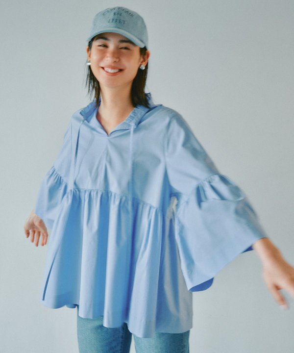 【抗菌防臭/洗える】コットンブロード フリルネックシャツ ¥7,990(税込)