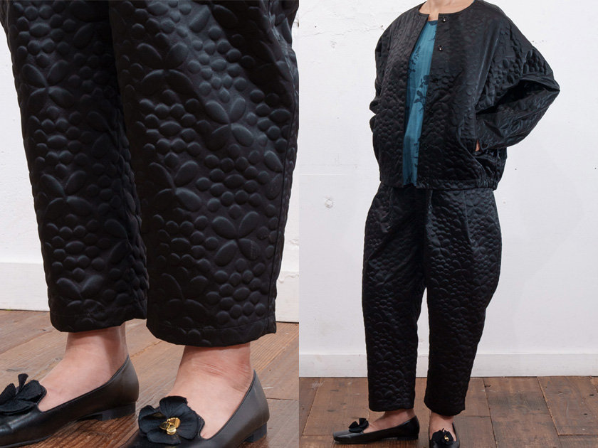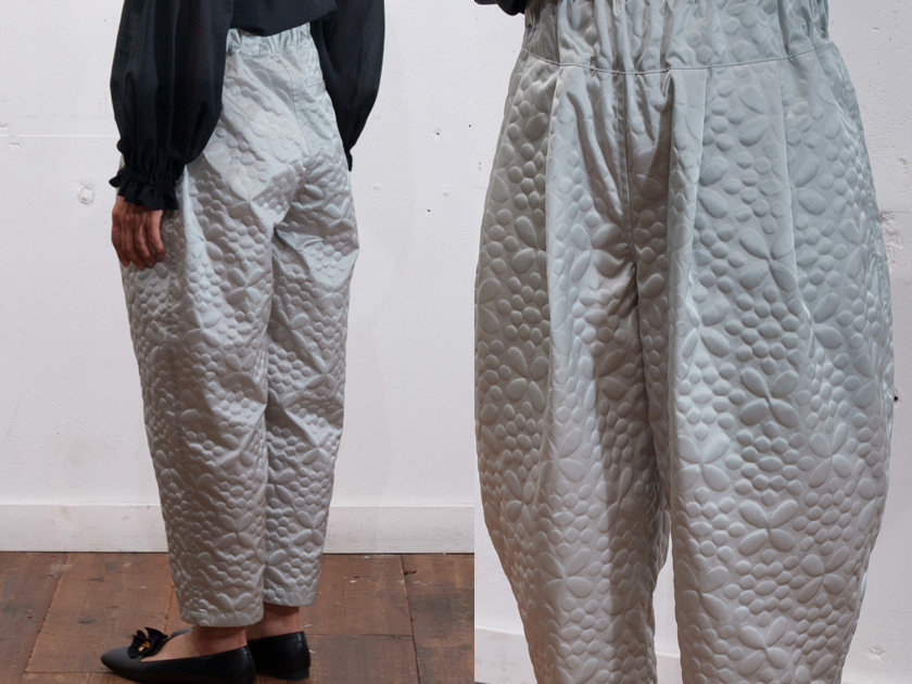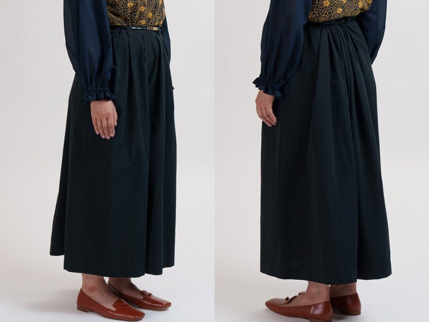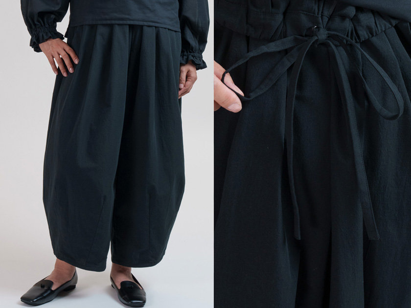 カーブを描いたシルエットのバルーンパンツはグレーカーキ・ブラックの2色展開、スカートのようなシルエットのワイドパンツはグレージュ・ネイビー・ブラックの3色展開でお作りしました。