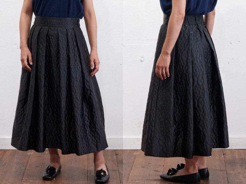 一年通して着ていただけます。しっかりと出るシルエットによって体型カバーが叶い、春夏シーズンに素足で合わせていただいても上品になり、ウエスト幅が大きめなので秋冬シーズンはタイツやレギンスを下に着ていただくのもお勧めです。