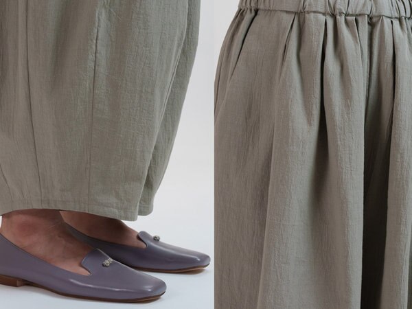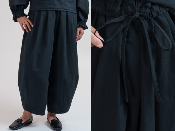 カーブを描いたシルエットのバルーンパンツはグレーカーキ・ブラックの2色展開、スカートのようなシルエットのワイドパンツはグレージュ・ネイビー・ブラックの3色展開でお作りしました。