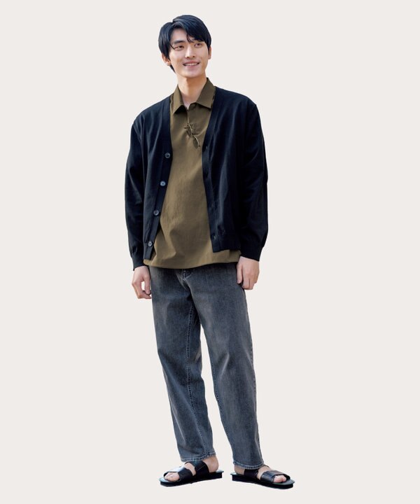 ブラックを基調にワントーンを意識したシックカラーでまとめると、メンズならではのスタイリッシュな着こなしに。レザーサンダルで足もとに抜けを作るとこなれ感が生まれます。