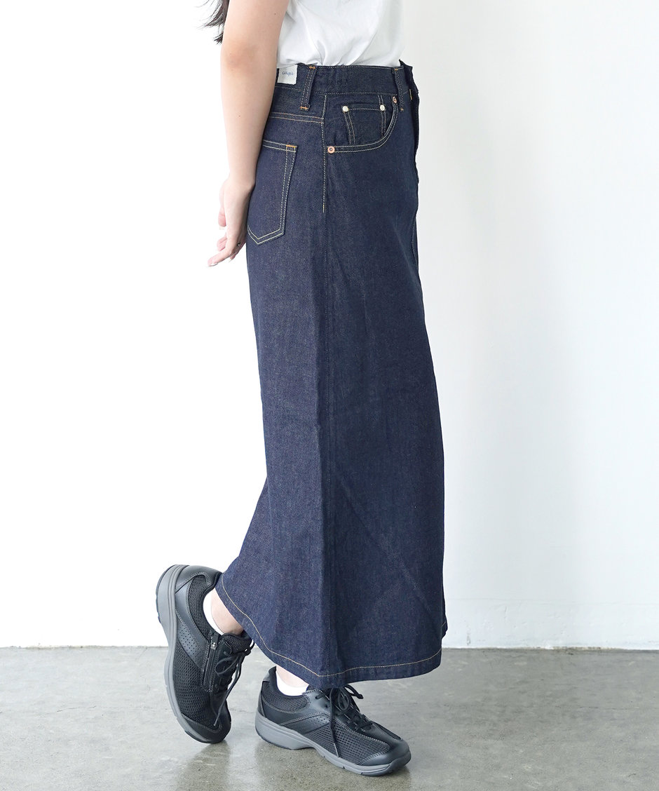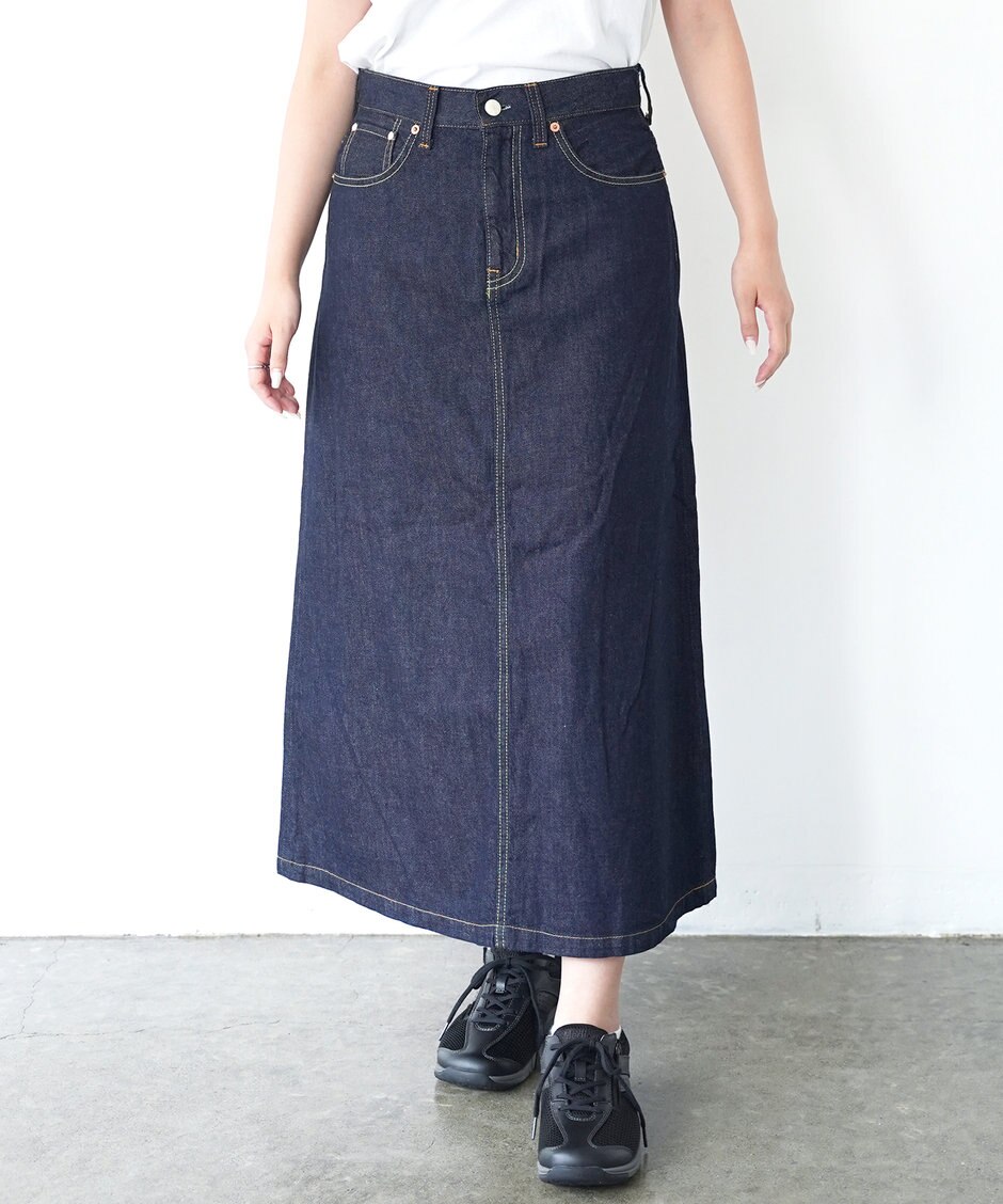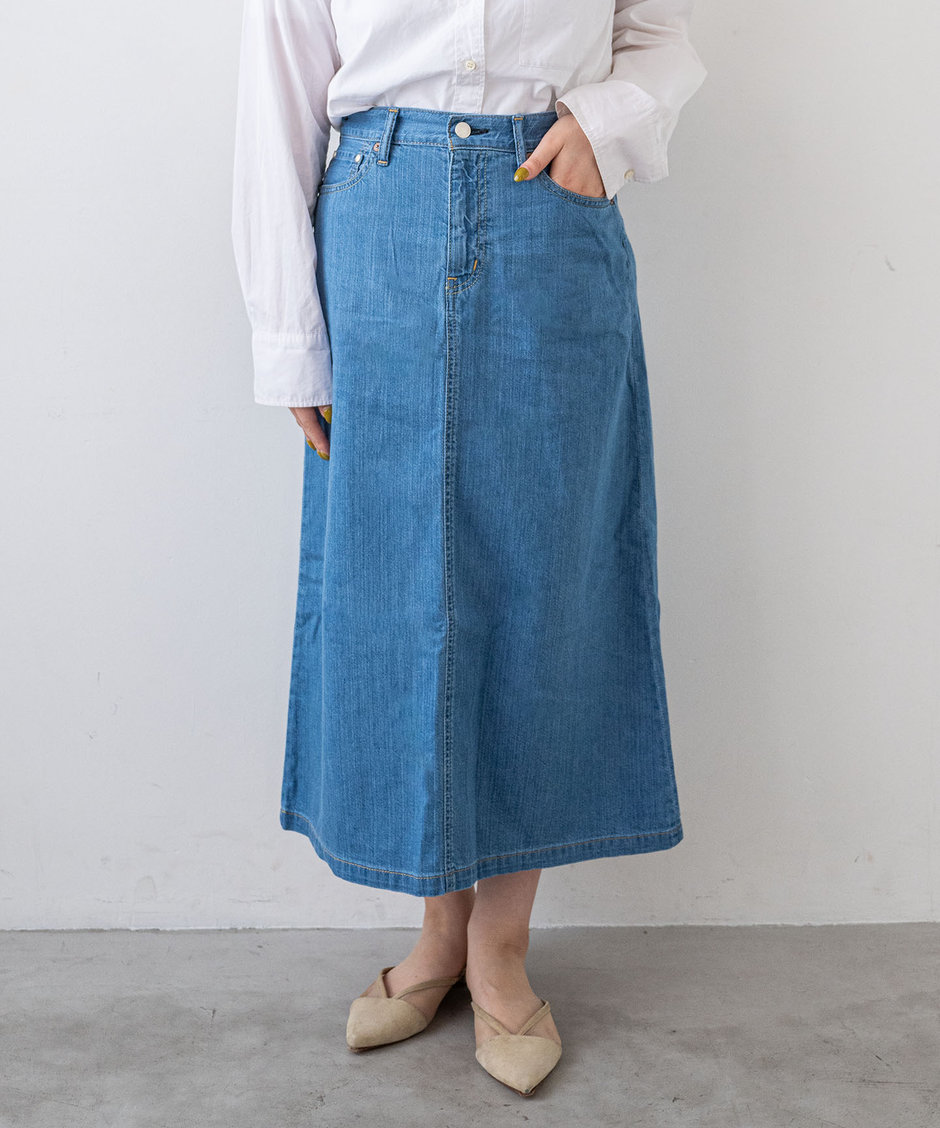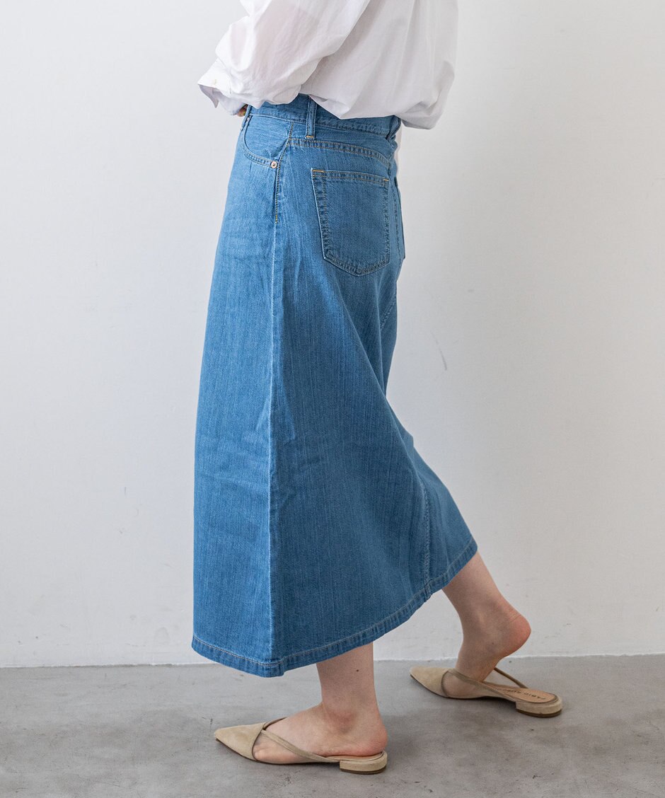Aラインでくるぶしまでの4/5丈デニムスカート。